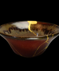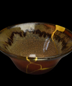 Autrefois brisé, ce bol a été magnifiquement ressuscité par la technique ancestrale du kintsugi. Chaque fracture a été méticuleusement réparée et sublimée par de l’or 24 carats pur, transformant ses imperfections en un réseau de lignes lumineuses, témoignage de son histoire et de sa résilience.