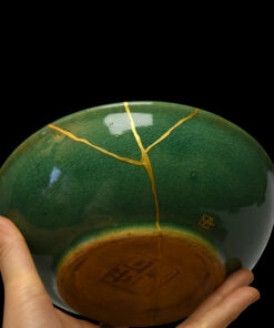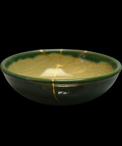 Autrefois brisé, ce bol a été magnifiquement ressuscité par la technique ancestrale du kintsugi. Chaque fracture a été méticuleusement réparée et sublimée par de l’or 24 carats pur, transformant ses imperfections en un réseau de lignes lumineuses, témoignage de son histoire et de sa résilience.