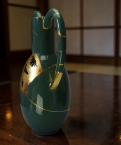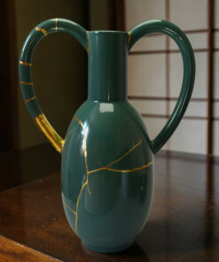 D’une hauteur de 34 cm, ce vase à l’émail vert prairie se distingue par une silhouette aux galbes généreux, dont les lignes fluides et les larges anses évoquent la douceur des formes naturelles. Cette pièce a fait l’objet d’une restauration de haute technicité selon le protocole du Kintsugi traditionnel.